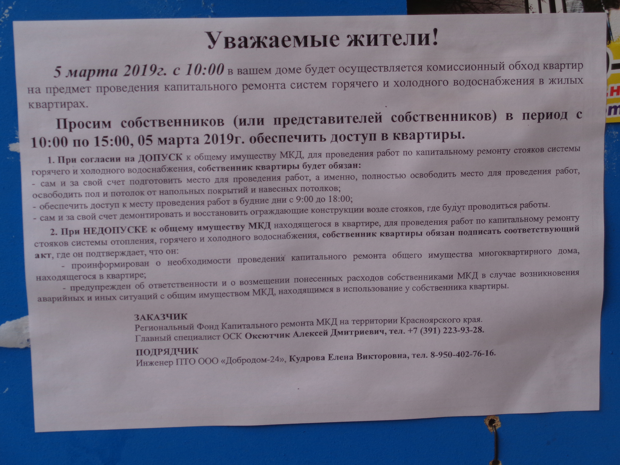 5.03.2019 г. с 10:00 в доме будет осуществляться комиссионный обход квартир на предмет проведения капитального ремонта систем горячего и холодного водоснабжения в жилых помещениях