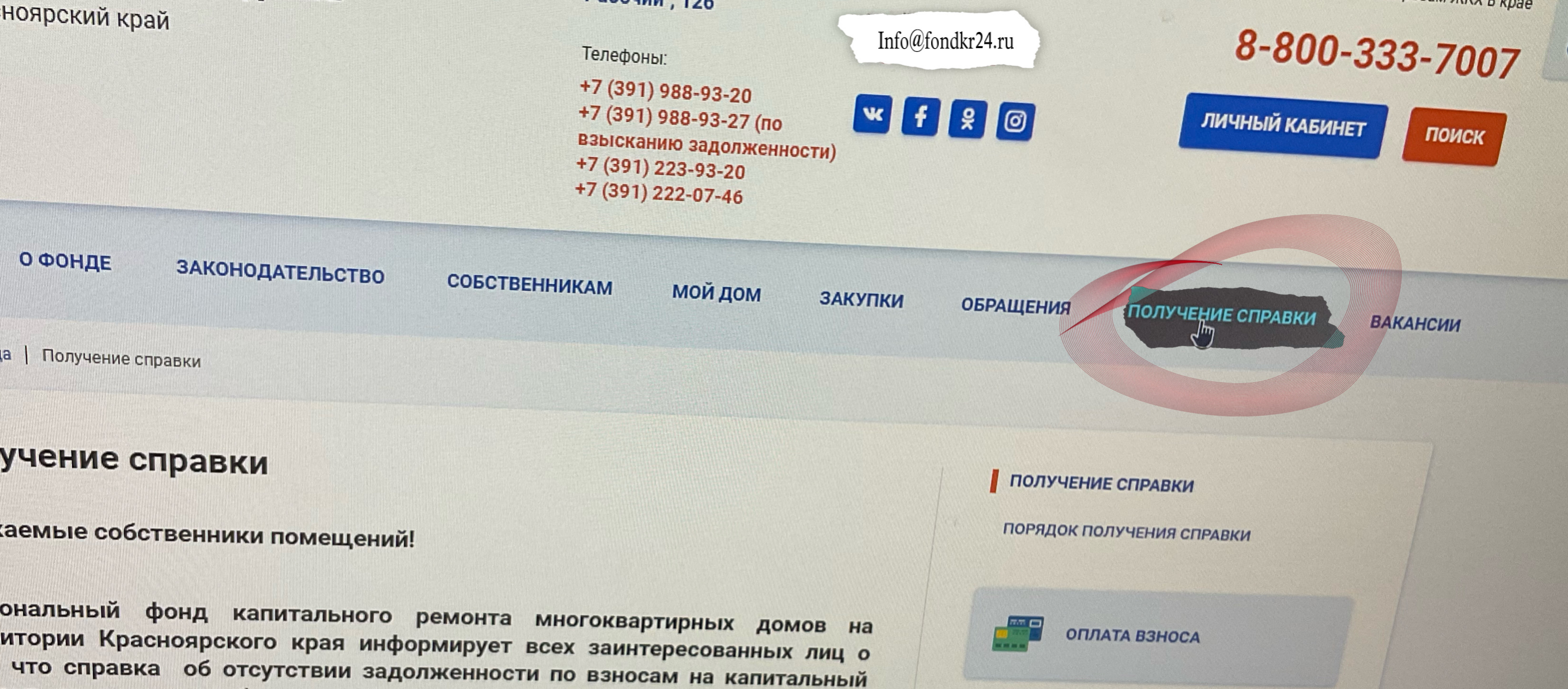Вся контактная информация (адрес Фонда, телефоны, адрес электронной почты, куда следует писать обращения) указаны в верхней части главной странице сайта (www.fondkr24.ru)