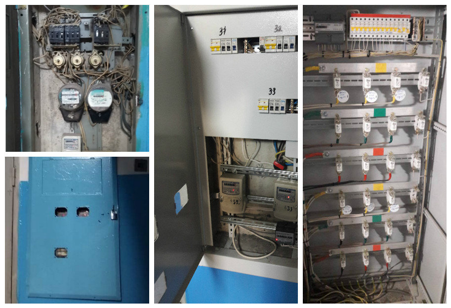 На фото внизу: г. Сосновоборск, ул. Энтузиастов, д. 11, до и после ремонта системы электроснабжения.