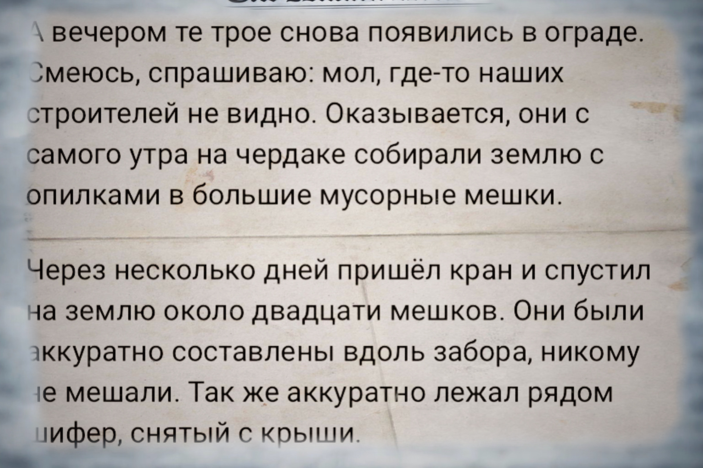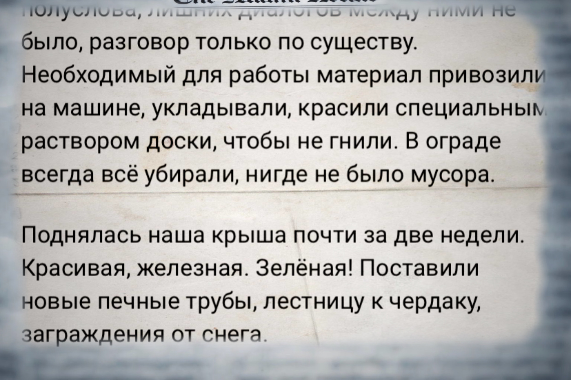 Из письма собственников: «Объект приняли. Все собрались в ограде, улыбаются, шутят. Как не похвалить бригаду, которая согласилась переделать, а точнее - сделать нам новую крышу! На свой страх и риск они лазали по нашим старым строениям! Всё! Крыша есть! А постепенно мы и старую пристройку переделаем! Надо спасать наш дом - дом, в котором мы живём!"