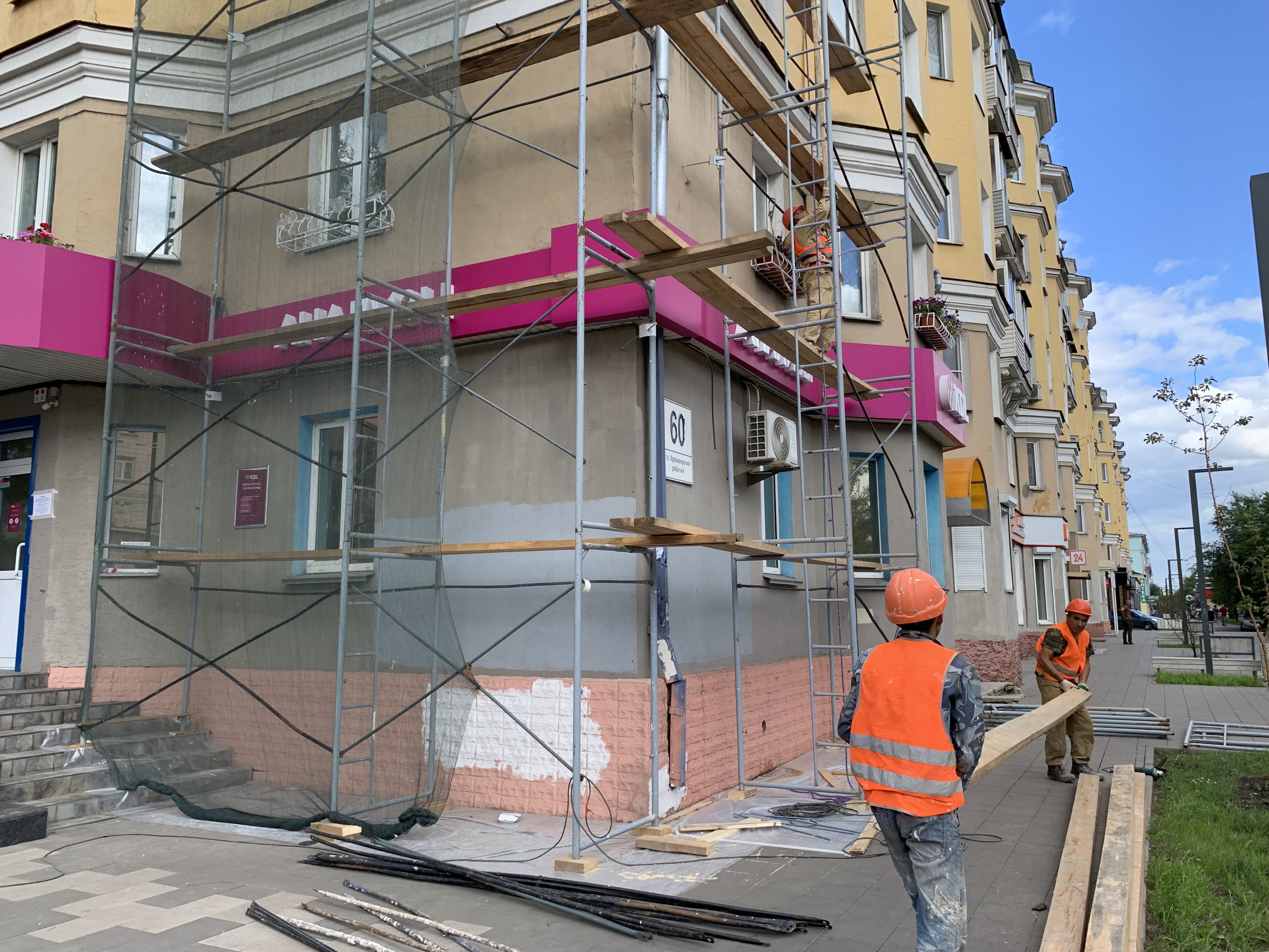 Еще один пример – «сталинка» на ул. Полузнова, 20. Новая шуба для дома в технике «шуба» - шутят рабочие. Работа также на финише. Что не скажешь о домах на пр. имени газеты Красноярский Рабочий. Здесь всё только начинается. Подрядчики вовсю готовят стены к ремонту, проводятся демонтажные работы.