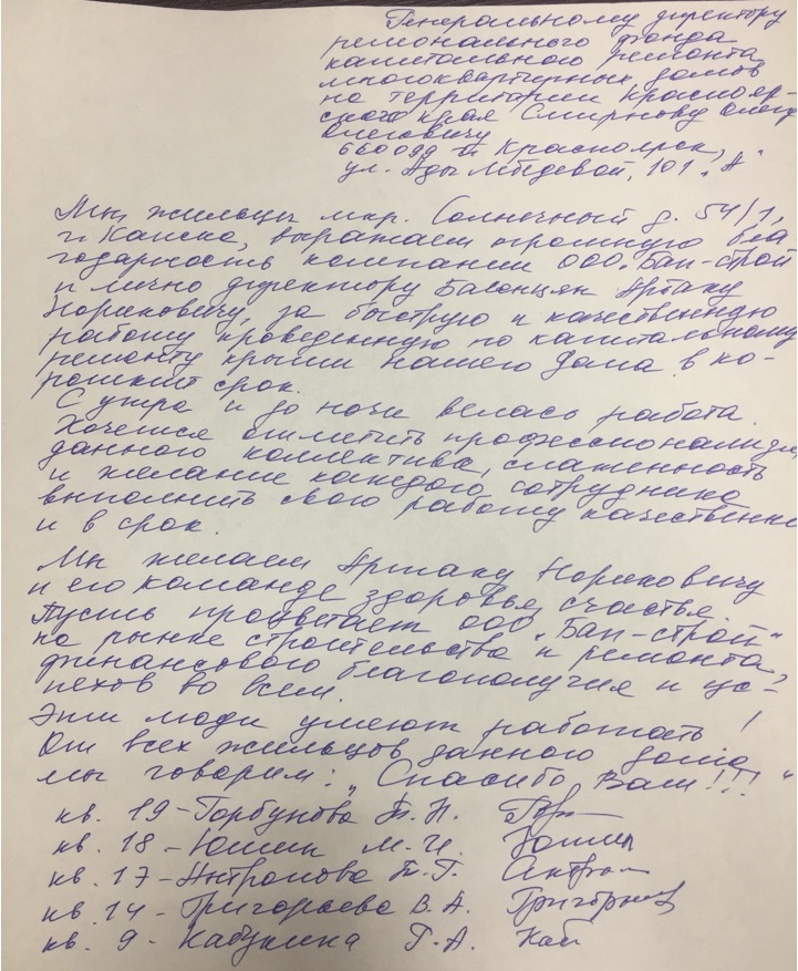 "Мы, жильцы мкр. Солнечный, дома 54/1 города Канска, выражаем огромную благодарность компании ООО "Бан-Строй" и лично директору Артаку Нориковичу за быструю и качественную работу по капитальному ремонту крыши нашего дома в короткий срок... Хочется отметить профессионализм данного коллектива, слаженность и желание каждого сотрудника выполнить свою работу качественно и в срок..."