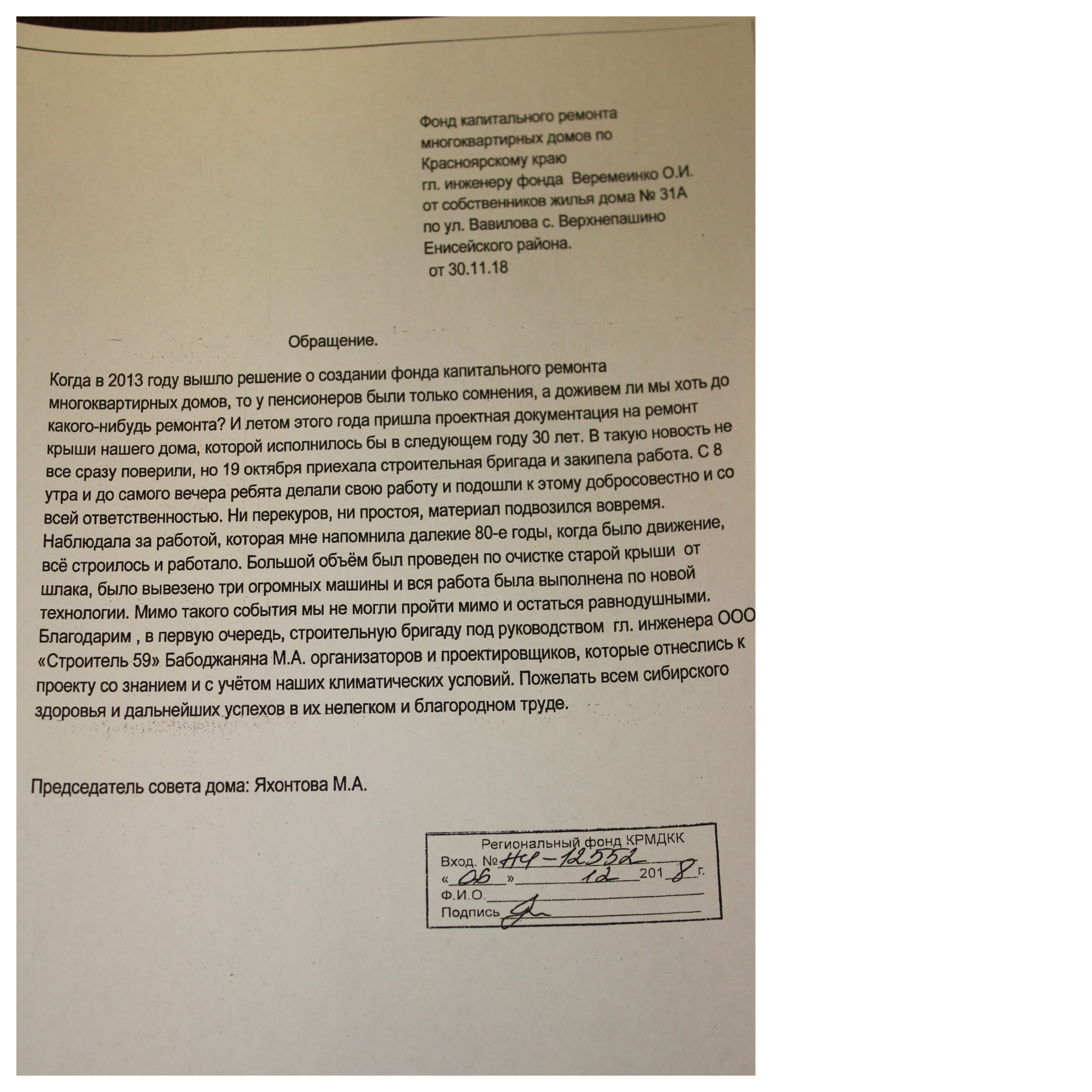Собственники многоквартирного дома из посёлка Верхнепашино Енисейского района обратились в фонд с благодарностью за хорошо отремонтированную крышу. Яхонтова М. А., председатель совета дома с ул. Вавилова, 31а пишет: