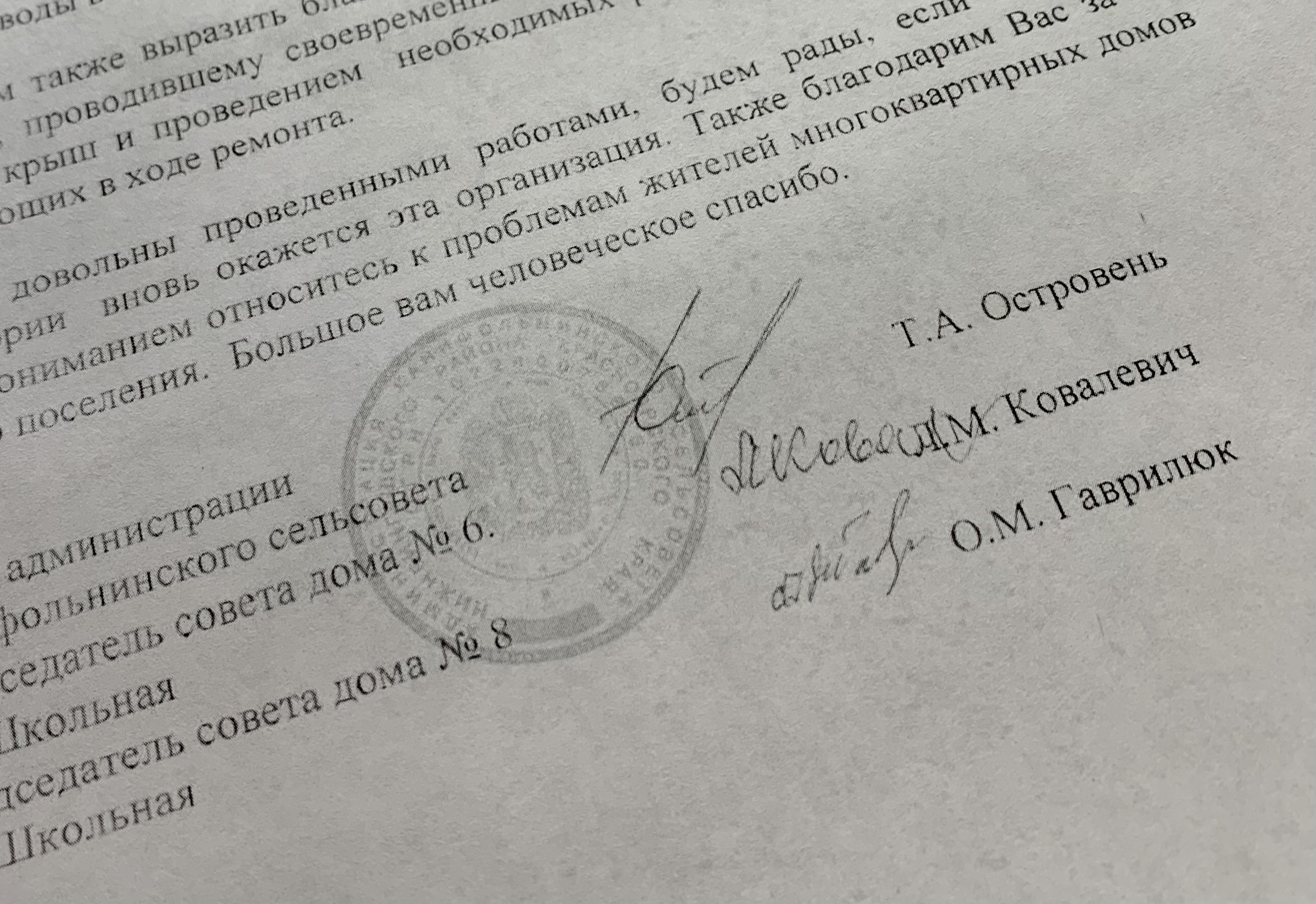 Также собственники поблагодарили куратора Фонда, «проводившего своевременный контроль за ходом капитального ремонта крыш и необходимые разъяснения и консультации, возникающие в ходе ремонта».